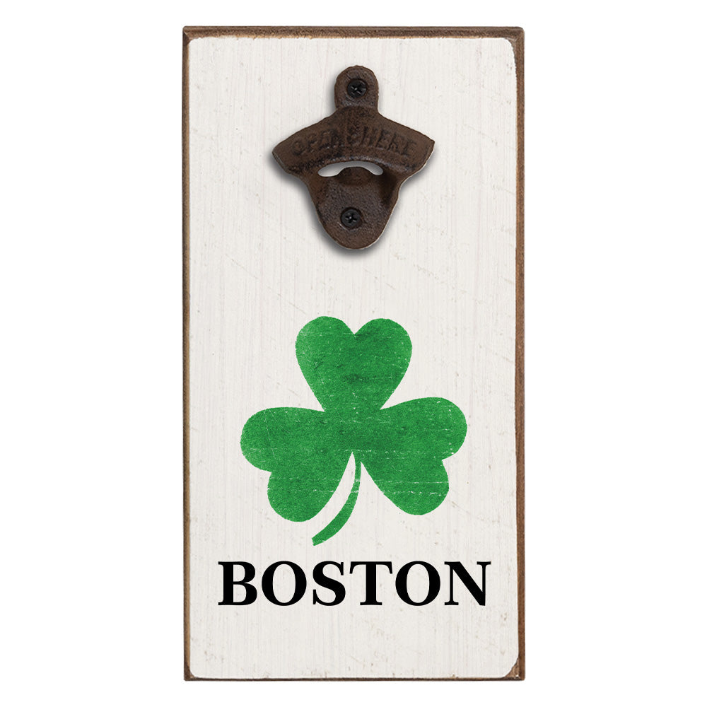 Crafted with a sturdy metal opener and a durable wooden base, this twine sign features a vibrant green shamrock and bold "Boston" lettering. The compact design allows for easy wall mounting, making it a versatile addition to any room. Ideal for St. Patrick's Day celebrations or as a thoughtful gift for friends and family, this bottle opener combines practicality with a personalized touch. Add a bit of Boston charm to your home today.