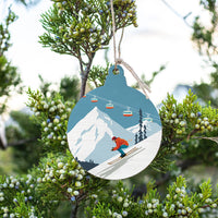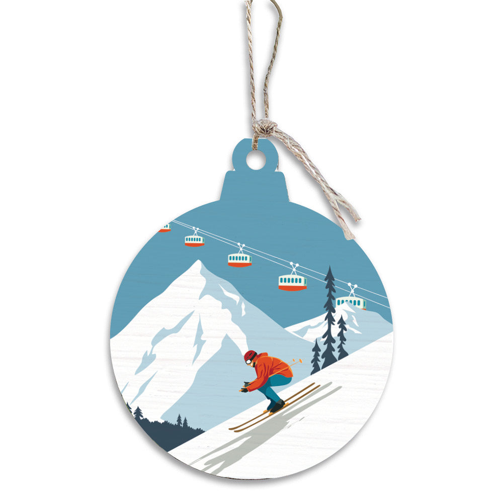 Crafted with attention to detail, this ornament features a vibrant skier against a backdrop of snow-capped peaks and cable cars, encapsulating the joy of a bluebird day. The durable material ensures it will be a cherished part of your holiday collection for years to come. With its easy-to-hang twine loop, this ski-themed decoration is perfect for enhancing your winter wonderland ambiance. Embrace the spirit of the season with this unique and eye-catching piece.