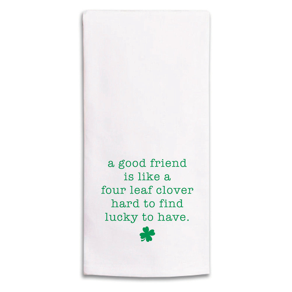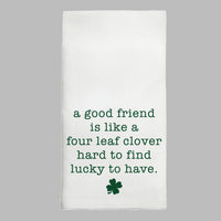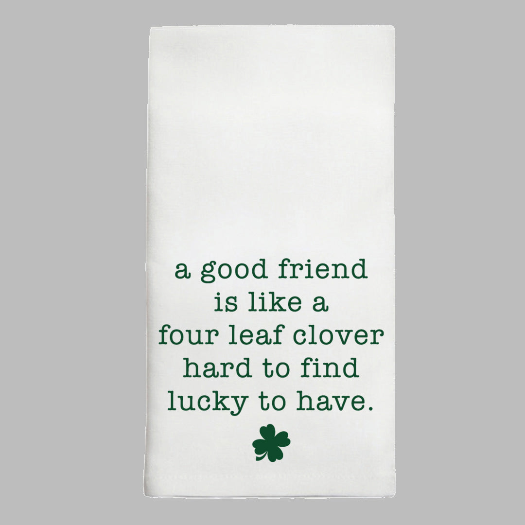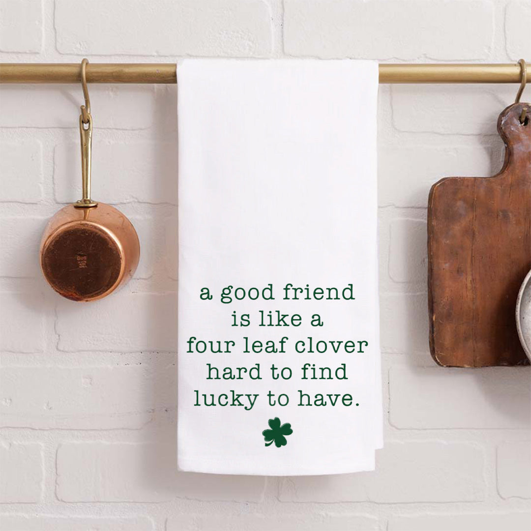 Elevate your kitchen decor with this charming tea towel, perfect for adding a touch of warmth and personality to your space. The delightful message, "a good friend is like a four leaf clover, hard to find, lucky to have," brings a heartfelt sentiment to your home, making it an ideal gift for friends or a thoughtful addition to your own collection. This tea towel not only enhances your kitchen's aesthetic but also serves as a daily reminder of the value of friendship.