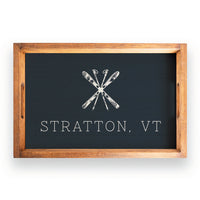 Crafted with a sturdy wooden frame, this serving tray features a navy blue background adorned with crossed skis and customizable text. The integrated handles ensure easy carrying, while the spacious surface provides ample room for serving. Pair it with a matching twine sign to complete your ski-themed decor. Whether used in the kitchen, living room, or dining area, this tray is a stylish and functional addition to your home. Perfect for gifting to ski lovers or adding a personal touch to your own space.