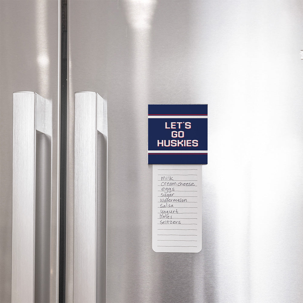 Crafted with durable materials, this magnet features bold lettering and a classic design that stands out. The deep blue background and contrasting white and red accents make it a striking addition to any decor. Whether you're a student, alumni, or a dedicated fan, this Huskies magnet is a must-have for game days and beyond. Add it to your collection of team memorabilia or gift it to a fellow supporter to spread the Huskies spirit.