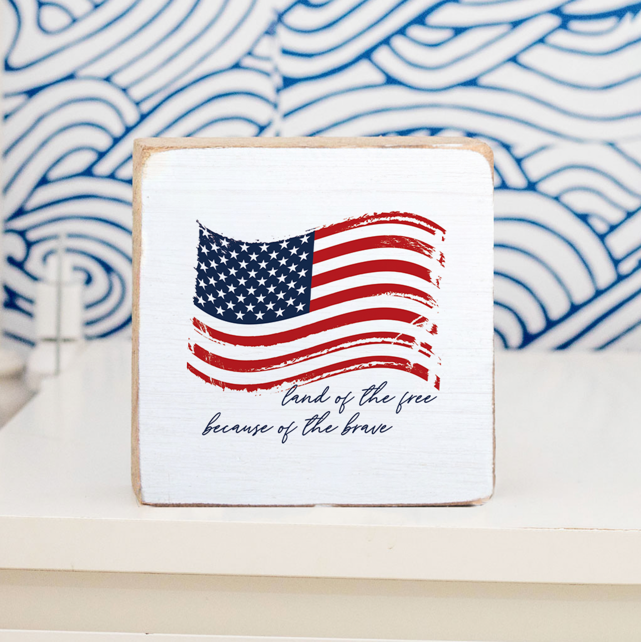Crafted from high-quality wood, this twine sign features a vibrant American flag design with the inspiring words "land of the free because of the brave." The durable construction ensures it will be a lasting piece in your collection. Easy to hang or display, this Square Block Sign is a meaningful way to honor the spirit of the nation. Perfect for Independence Day, Memorial Day, or everyday decor, it’s a timeless tribute to American heritage.